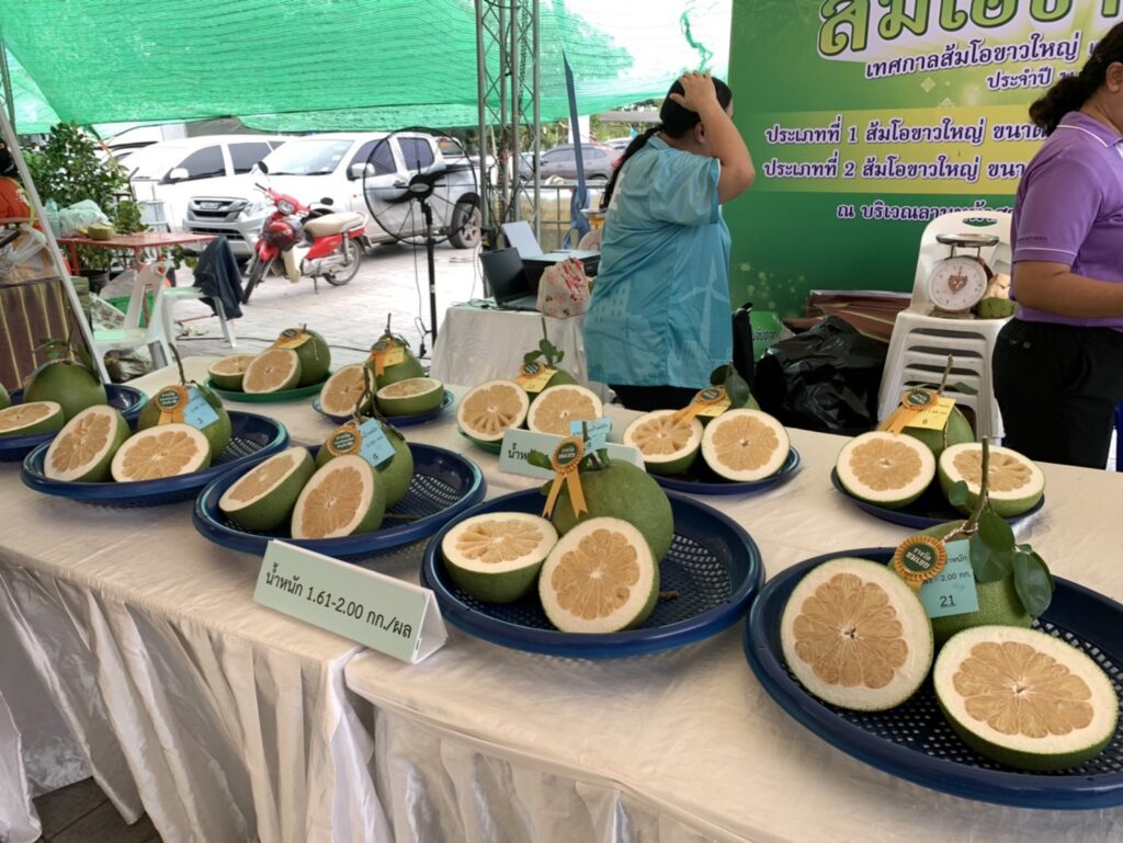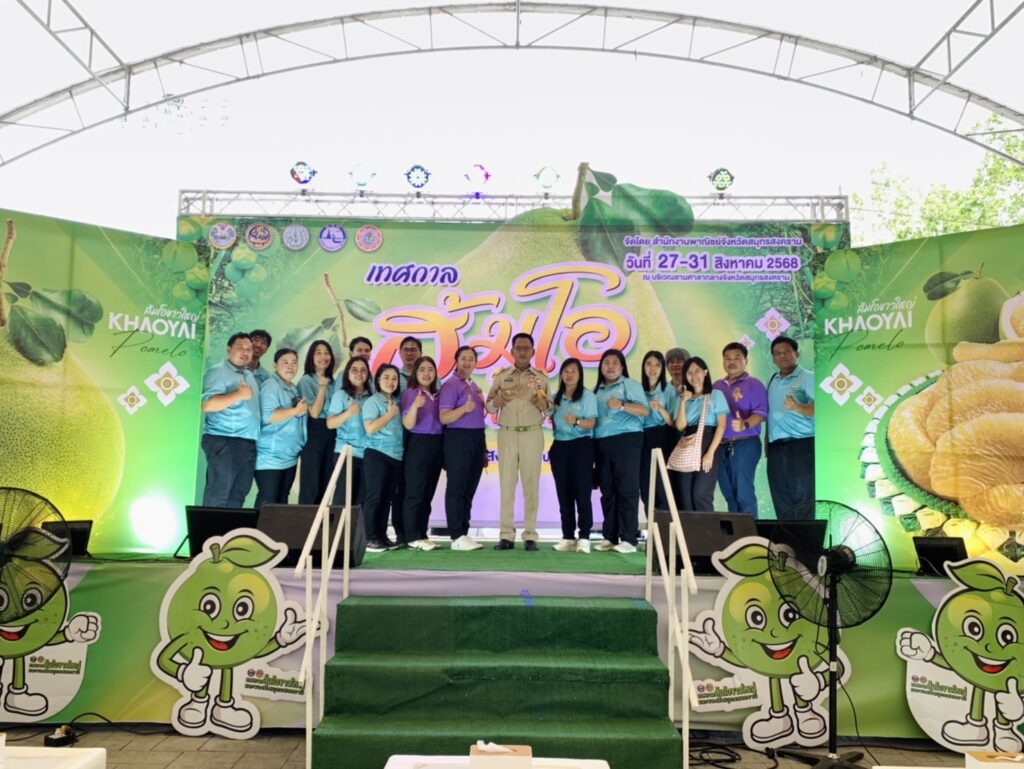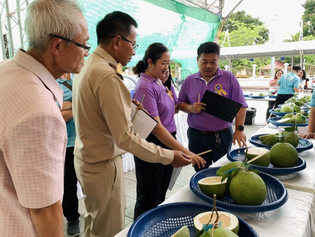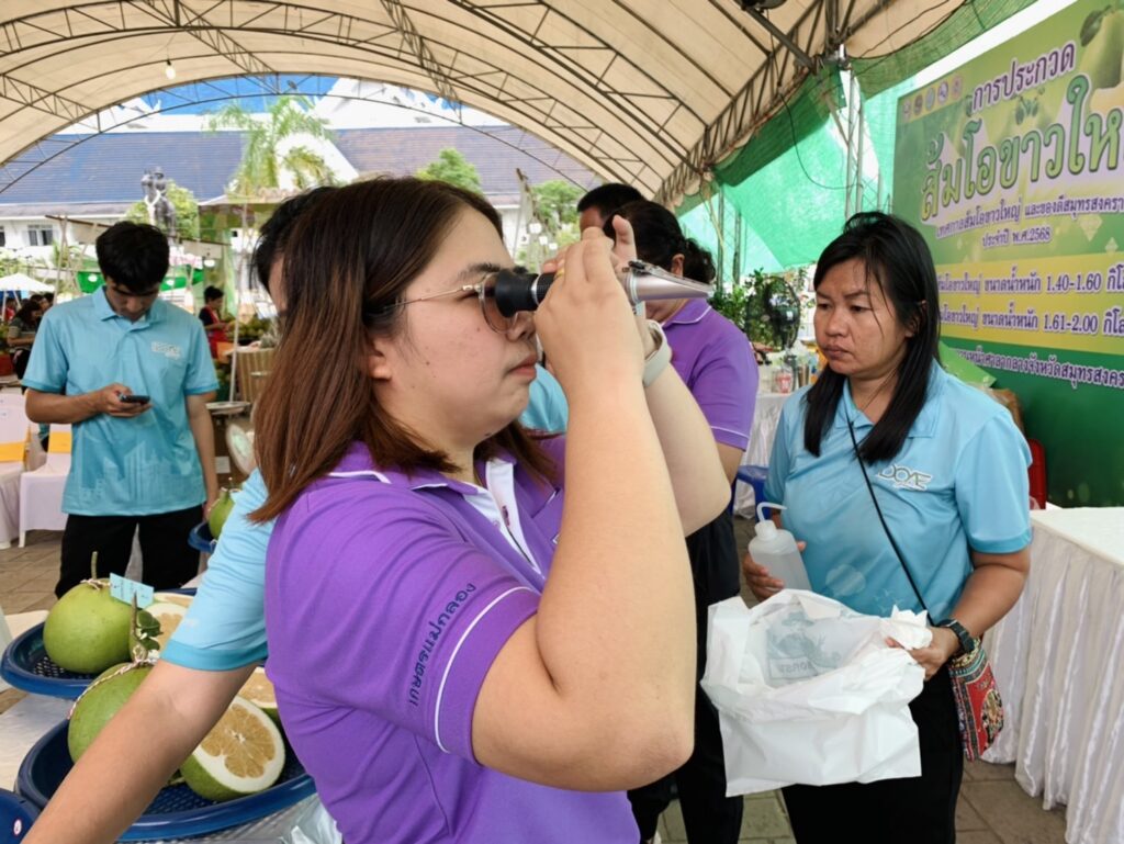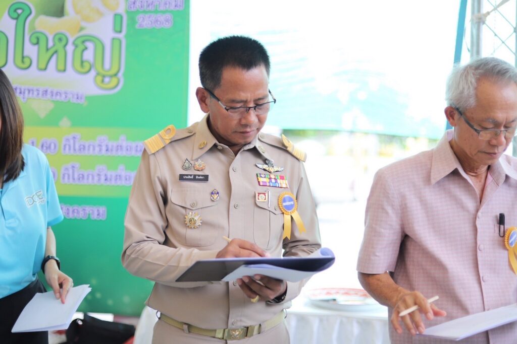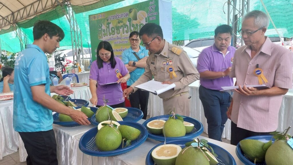 จัดกิจกรรมการประกวดส้มโอขาวใหญ่สมุทรสงคราม ในงาน “เทศกาลส้มโอขาวใหญ่และของดีสมุทรสงคราม ประจำปี 2568″ โดยแบ่งการประกวดเป็น 2 ประเภท ได้แก่ ประเภทน้ำหนัก 1.40 – 1.60 กิโลกรัม และประเภทน้ำหนัก 1.61 – 2.00 กิโลกรัม เพื่อเป็นการประชาสัมพันธ์ส้มโอขาวใหญ่สมุทรสงครามและเป็นการเสริมสร้างขวัญและกำลังใจให้แก่เกษตรกรผู้ปลูกส้มโอขาวใหญ่ในพื้นที่จังหวัดสมุทรสงคราม ทั้งนี้ผู้ชนะได้รับประกาศนียบัตรประกาศเกียรติคุณและเงินรางวัลจากผู้ว่าราชการจังหวัดสมุทรสงคราม