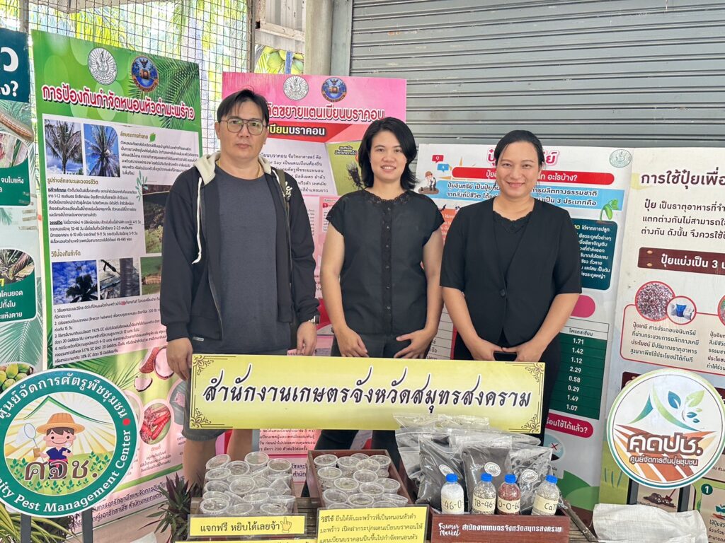👩‍🌾วันที่ 15 พฤศจิกายน 2568 นางสาวฉัตรแก้ว จันทร์คง เกษตรอำเภอบางคนที ร่วมกับนายประสิทธิ์ สิงห์ชา เกษตรจังหวัดสมุทรสงคราม พร้อมด้วยเจ้าหน้าที่สำนักงานเกษตรอำเภอบางคนที และเจ้าหน้าที่สำนักงานเกษตรจังหวัดสมุทรสงคราม ร่วมพิธีเปิด “ตลาดร่องสวนยายแพง แหล่งของดี วิถีพอเพียง“ โดยมีนายชยชัย แสงอินทร์ ผู้ว่าราชการผู้หวัดสมุทรสงคราม เป็นประธาน โดยตลาดร่องสวนยายแพง เปิดจำหน่ายทุกวันเสาร์ – อาทิตย์ เวลา 09.00 – 14.00 น. ณ หมู่ที่ 4 ตำบลยายแพง ภายในตลาดมีทั้งอาหารคาว หวาน ผลผลิตทางการเกษตร การแสดงนิทรรศการความรู้ด้านเกษตรปลอดภัย วิถีมะพร้าว และภูมิปัญญาท้องถิ่น รวมถึงกิจกรรมพายเรือ การทำไม้กวาดทางมะพร้าว และเพ้นท์ผ้ามัดย้อมสีธรรมชาติจากเปลือกมะพร้าว ซึ่งตลาดแห่งนี้ได้รับการสนับสนุนและร่วมแรงร่วมใจจากองค์กรปกครองส่วนท้องถิ่น ผู้นำท้องที่ จิตอาสา และประชาชนในตำบลยายแพง
