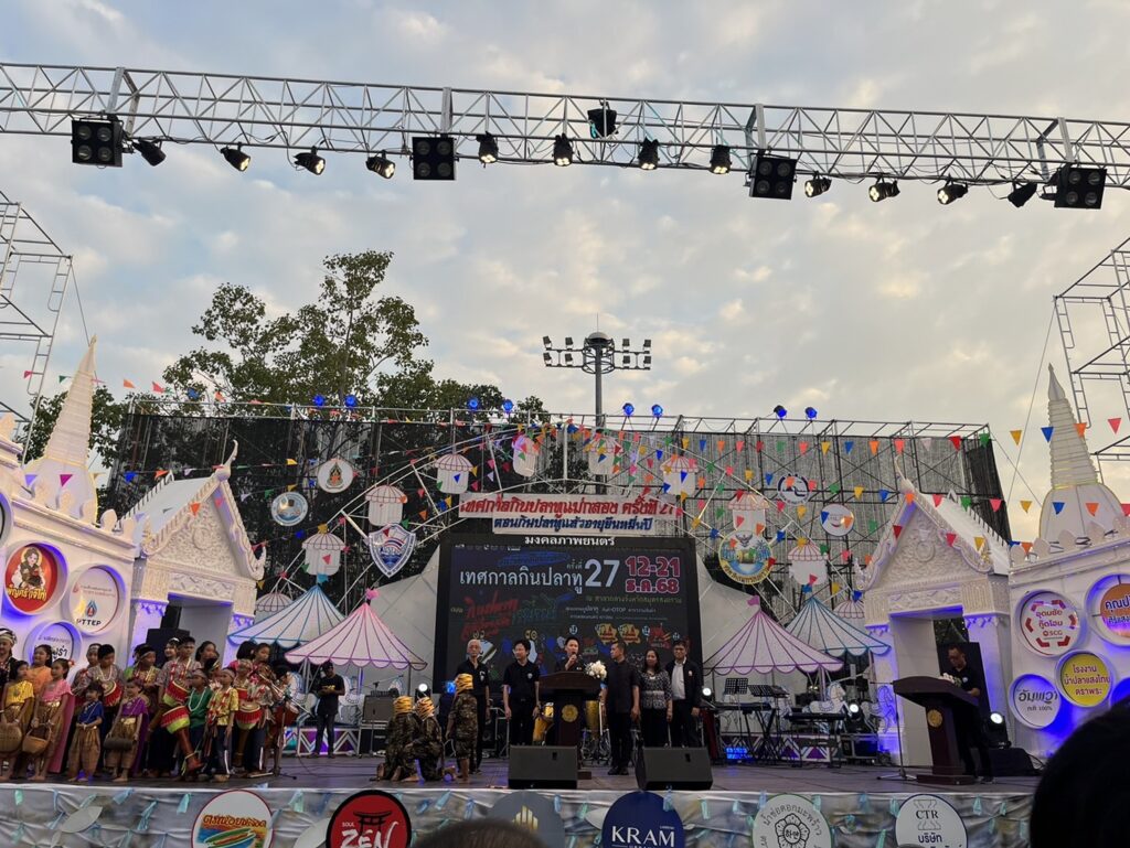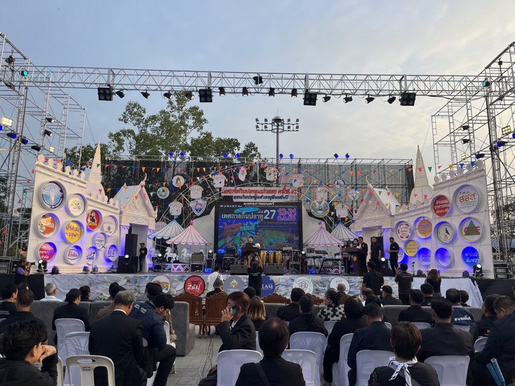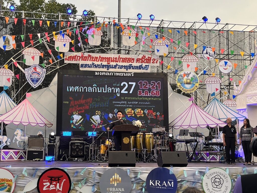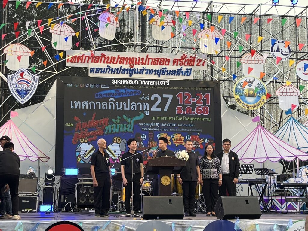 นายประสิทธิ์ สิงห์ชา #เกษตรจังหวัดสมุทรสงคราม ร่วมเป็นเกียรติในพิธีเปิดงานเทศกาลกินปลาทูและของดีเมืองแม่กลอง จังหวัดสมุทรสงคราม ครั้งที่ 27 มีวัตถุประสงค์เพื่อส่งเสริม รักษาชื่อเสียง และคุณภาพของอาหารทะเลและผลผลิตทางการเกษตรของจังหวัดสมุทรสงคราม โดยมีนาย อรรถกร ศิริลัทธยากร รัฐมนตรีว่าการกระทรวงการท่องเที่ยวและกีฬา เป็นประธานในพิธีเปิด มีกำหนดจัดงานดังกล่าวในระหว่างวันที่ 12-21 ธันวาคม 2568 ณ บริเวณลานหน้าศาลากลางจังหวัดสมุทรสงคราม