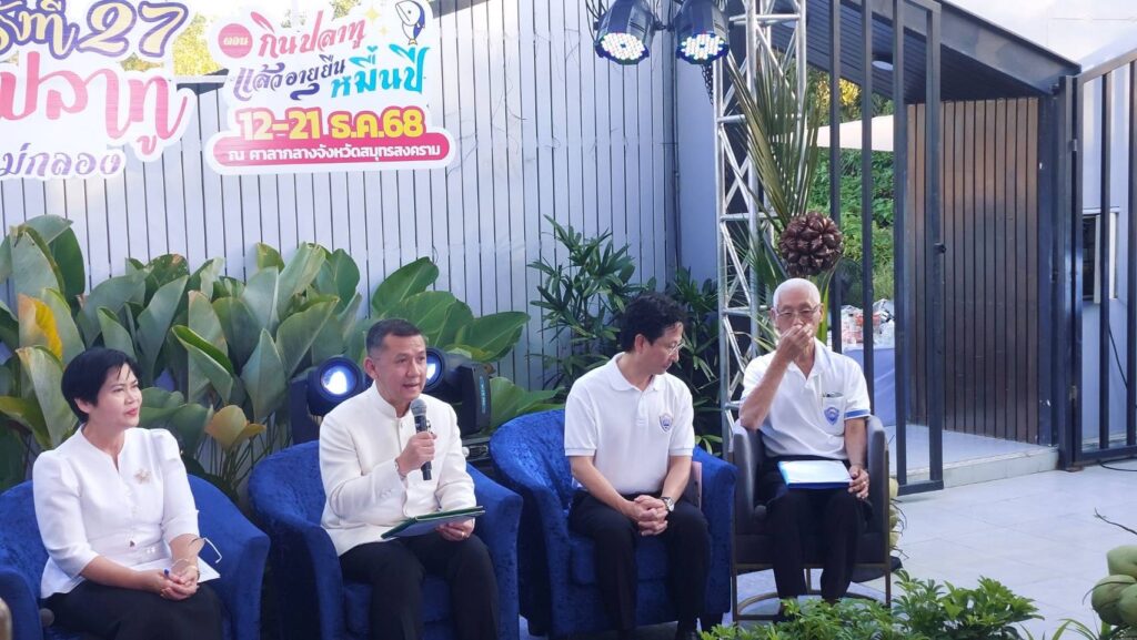 วันที่ 2 ธันวาคม 2568 เวลา 16.00 น. นายประสิทธิ์ สิงห์ชา #เกษตรจังหวัดสมุทรสงคราม มอบหมายให้ นายเสนีย์ ตรุยานนท์ หัวหน้ากลุ่มยุทธศาสตร์และสารสนเทศ ร่วมงานแถลงข่าวงานเทศกาลกินปลาทูและของดีเมืองแม่กลอง ครั้งที่ 27 เพื่อเป็นการประชาสัมพันธ์การจัดงานให้เป็นที่รู้จักมากยิ่งขึ้น โดยมีนายชยชัย แสงอินทร์ ผู้ว่าราชการจังหวัดสมุทรสงคราม เป็นประธาน ณ โรงแรมเออร์บาน่า เฮ้าส์ จังหวัดสมุทรสงคราม