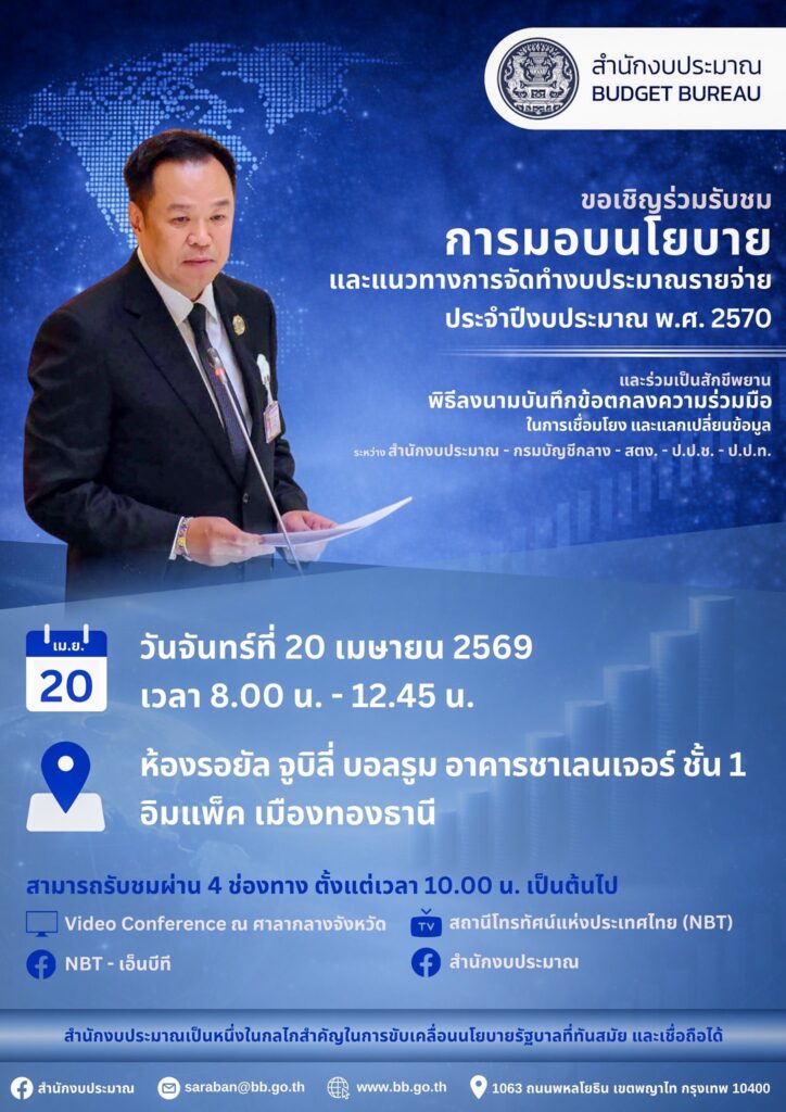 วันที่ 20 เมษายน 2569 นายประสิทธิ์ สิงห์ชา เกษตรจังหวัดสมุทรสงคราม มอบหมายให้เจ้าหน้าที่กลุ่มยุทธศาสตร์และสารสนเทศ เข้าร่วมการประชุมการมอบนโยบายและแนวทางการจัดทำงบประมาณรายจ่ายประจำปีงบประมาณ พ.ศ. 2570 ผ่านการประชุมทางไกลระบบออนไลน์ โดยมีนายอนุทิน ชาญวีรกูล นายกรัฐมนตรี เป็นประธานและมอบนโยบาย ณ ห้องรอยัล จูบิลี่ บอลลูน อาคารชาเลนเจอร์ ศูนย์แสดงสินค้าและการประชุมอิมแพ็ค เมืองทองธานี จังหวัดนนทบุรี ซึ่งจังหวัดสมุทรสงครามร่วมรับฟัง ณ ห้องประชุมอัมพวา ชั้น 4 ศาลากลางจังหวัดสมุทรสงคราม โดยมีนายชัยวัฒน์ วิเศษการ หัวหน้าสำนักงานจังหวัดสมุทรสงคราม เป็นประธาน และส่วนราชการเข้าร่วม เพื่อรับฟังนโยบายและจัดทำงบประมาณรายจ่ายประจำปี พ.ศ. 2570 ให้สอดคล้องกับนโยบายของรัฐบาล