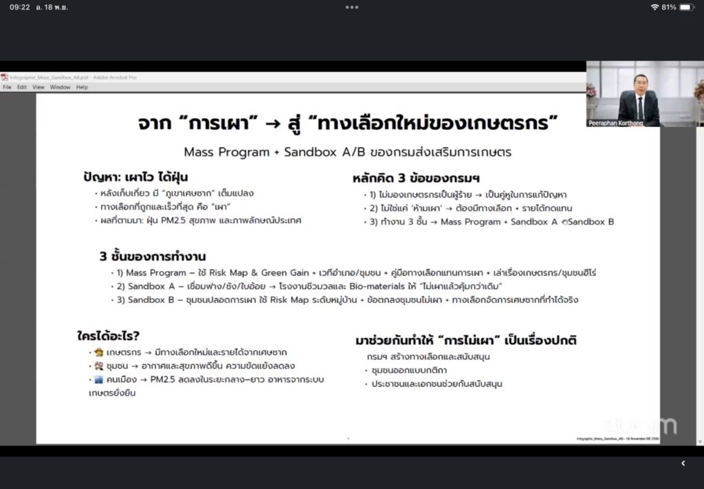 3) Sandbox B – ชุมชนปลอดการเผา ใช้ Risk Map ระดับหมู่บ้าน ข้อตกลงชุมชนไม่เผา และสร้างทางเลือกจัดการเศษซากที่ทำได้จริง