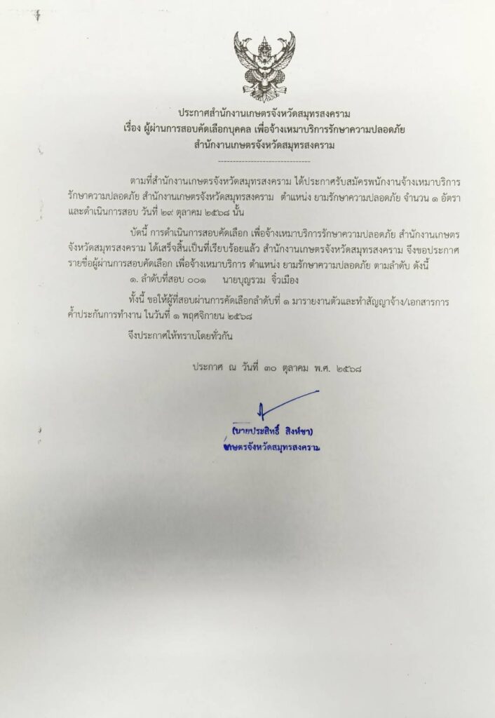ประกาศสำนักงานเกษตรจังหวัดสมุทรสงครามBy admin_doae / 30 ตุลาคม 2025 เรื่อง ผู้ผ่านการสอบคัดเลือกบุคคล เพื่อจ้างเหมาบริการรักษาความปลอดภัย สำนักงานเกษตรจังหวัดสมุทรสงคราม