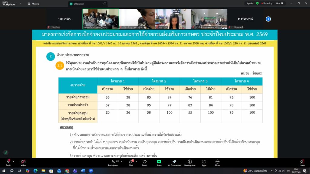 วันที่ 26 กุมภาพันธ์ 2569 นายประสิทธิ์ สิงห์ชา #เกษตรจังหวัดสมุทรสงคราม มอบหมายให้เจ้าหน้าที่ฝ่ายบริหารทั่วไป เข้าร่วมประชุมคลินิกงานคลัง ประจำปีงบประมาณ พ.ศ. 2569 ครั้งที่ 2/2569 ผ่านโปรแกรม zoom Workplace ดำเนินการโดย กองคลัง กรมส่งเสริมการเกษตร เพื่อติดตามผลการดำเนินงานด้านการเงินการคลัง บัญชี และพัสดุ ประจำปีงบประมาณ พ.ศ. 2569 รวมทั้งให้คำปรึกษา คำแนะนำ และแนวทางการแก้ไขปัญหาที่เกิดขึ้นในการปฏิบัติงานให้ถูกต้องเป็นไปตามระเบียบของทางราชการ