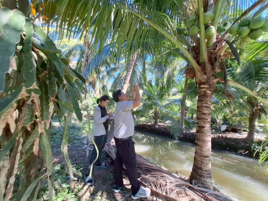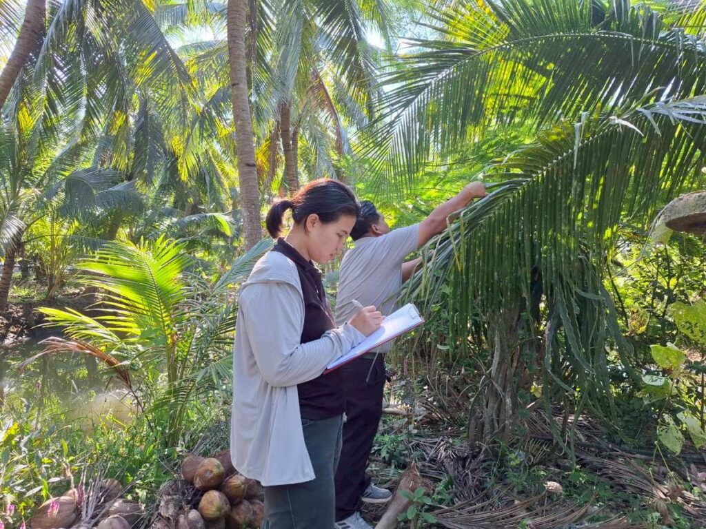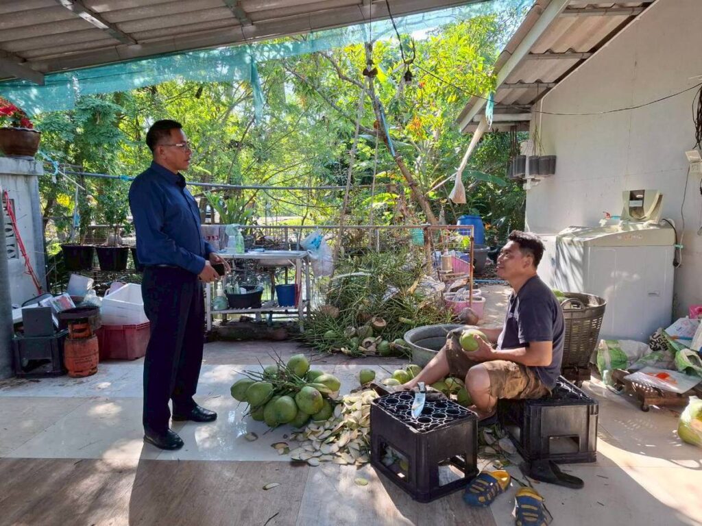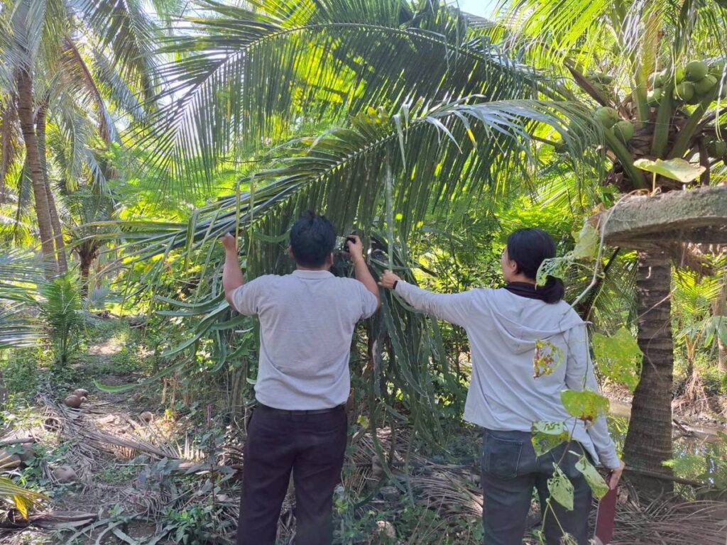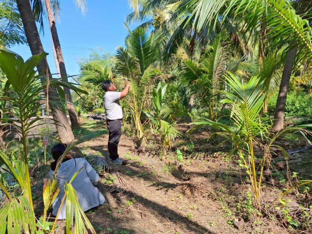 วันที่ 16 ธันวาคม 2568 นายประสิทธิ์ สิงห์ชา #เกษตรจังหวัดสมุทรสงคราม พร้อมด้วย เจ้าหน้าที่กลุ่มอารักขาพืชและเจ้าหน้าที่สำนักงานเกษตรอำเภอเมืองสมุทรสงคราม ลงพื้นที่ร่วมกับเกษตรกรสำรวจแปลงติดตามสถานการณ์ศัตรูพืช ภายใต้โครงการส่งเสริมการจัดการสุขภาพพืชเพื่อเพิ่มประสิทธิภาพการผลิตสินค้าเกษตร ประจำปีงบประมาณ พ.ศ. 2569 เพื่อสำรวจและจัดเก็บข้อมูลศัตรูพืชและสภาพอากาศในแปลงพืชเศรษฐกิจสำคัญจากWeather Station สำหรับพัฒนาแอปพลิเคชัน DOAE PEST FORECAST ครั้งที่3 แลกเปลี่ยนปัญหา ข้อเสนอแนะร่วมกับเกษตรกรผู้ปลูกมะพร้าว ณ แปลงมะพร้าวนายครรชิต น่วมสวัสดิ์ หมู่ 5 ตำบลแหลมใหญ่ อำเภอเมืองฯ จังหวัดสมุทรสงคราม