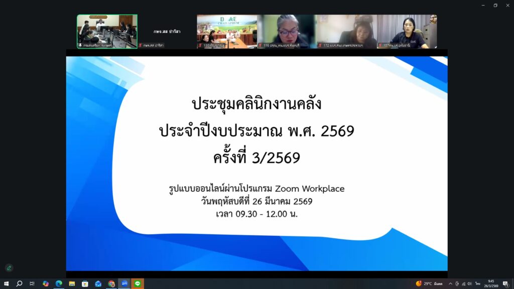วันที่ 26 มีนาคม 2569 นายประสิทธิ์ สิงห์ชา เกษตรจังหวัดสมุทรสงคราม พร้อมหัวหน้าฝ่ายบริหารทั่วไป เข้าร่วมประชุมคลินิกงานคลัง ประจำปีงบประมาณ พ.ศ. 2569 ครั้งที่ 3/2569 ผ่านโปรแกรม zoom Workplace ดำเนินการโดย กองคลัง กรมส่งเสริมการเกษตร เพื่อติดตามผลการดำเนินงานด้านการเงินการคลัง บัญชี และพัสดุ ประจำปีงบประมาณ พ.ศ. 2569 รวมทั้งให้คำปรึกษา คำแนะนำ และแนวทางการแก้ไขปัญหาที่เกิดขึ้นในการปฏิบัติงานให้ถูกต้องเป็นไปตามระเบียบของทางราชการ