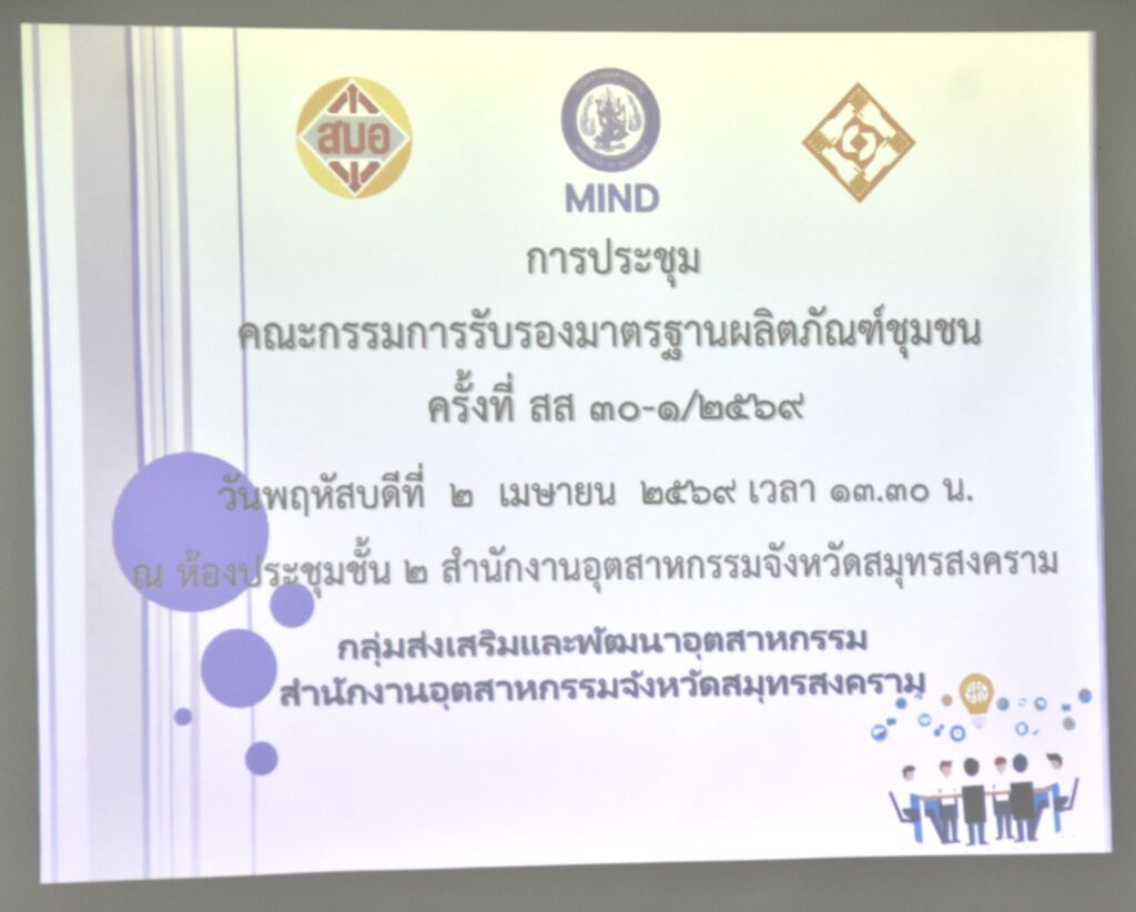 วันที่ 2 เมษายน 2569 เวลา 13.30 น. นายประสิทธิ์ สิงห์ชา #เกษตรจังหวัดสมุทรสงคราม ร่วมประชุมคณะกรรมการรับรองมาตรฐานผลิตภัณฑ์ชุมชนจังหวัดสมุทรสงคราม ครั้งที่ สส 30-1/2569 โดยมี นายชยชัย แสงอินทร์ ผู้ว่าราชการจังหวัดสมุทรสงคราม เป็นประธานการประชุม ณ ห้องประชุมชั้น 2 สำนักงานอุตสาหกรรมจังหวัดสมุทรสงคราม