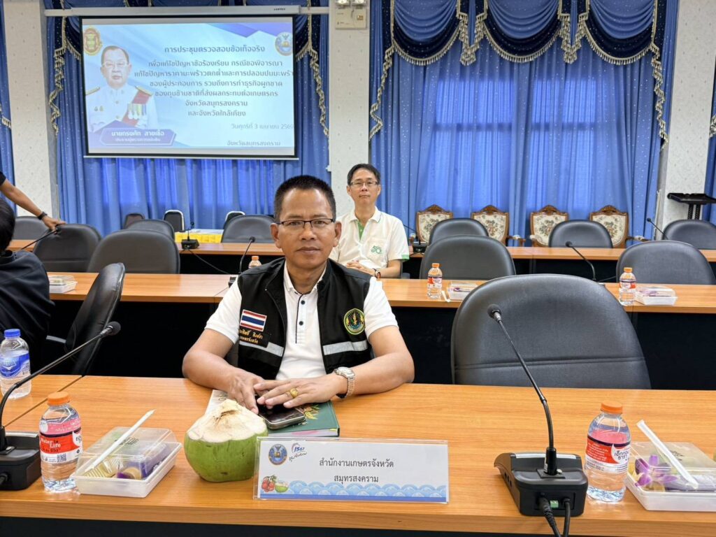 วันที่ 3 เมษายน 2569 นายประสิทธิ์ สิงห์ชา เกษตรจังหวัดสมุทรสงคราม พร้อมด้วย นายเสนีย์ ตรุยานนท์ หัวหน้ากลุ่มยุทธศาสตร์และสารสนเทศ เข้าร่วมประชุมและลงพื้นที่ตรวจสอบข้อเท็จจริงในพื้นที่เพื่อพิจารณาแก้ไขปัญหาราคามะพร้าวตกต่ำและการปลอมปนน้ำมะพร้าวของผู้ประกอบการ รวมถึงการทำธุรกิจผูกขาดของทุนข้ามชาติ ที่ส่งผลกระทบต่อเกษตรกรจังหวัดสมุทรสงครามและจังหวัดข้างเคียง ร่วมกับ ทรงศัก สายเชื้อ ประธานผู้ตรวจการแผ่นดิน และคณะ โดยมี นายชยชัย แสงอินทร์ ผู้ว่าราชการจังหวัดสมุทรสงคราม และหัวหน้าส่วนราชการเข้าร่วมประชุม ณ ห้องประชุมแม่กลอง ชั้น 5 ศาลากลางจังหวัดสมุทรสงคราม และ ที่ทำการกลุ่มแปลงใหญ่มะพร้าวตำบลปลายโพงพาง อำเภออัมพวา จังหวัดสมุทรสงคราม