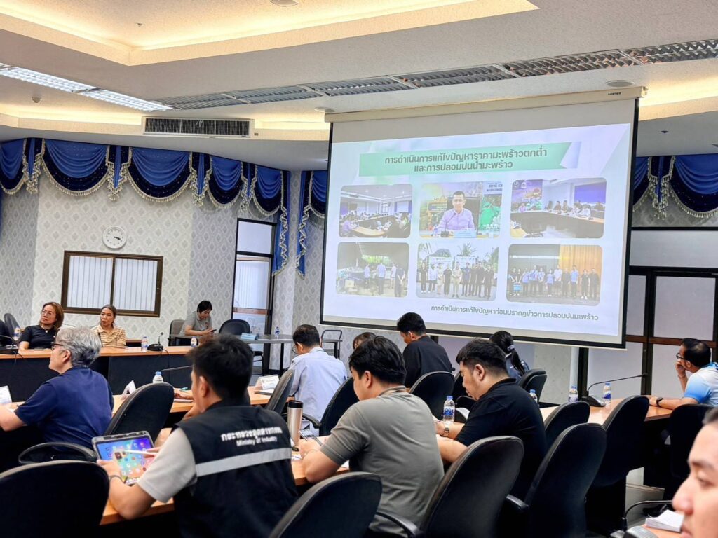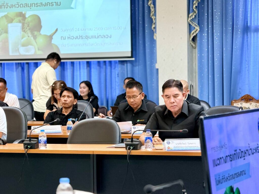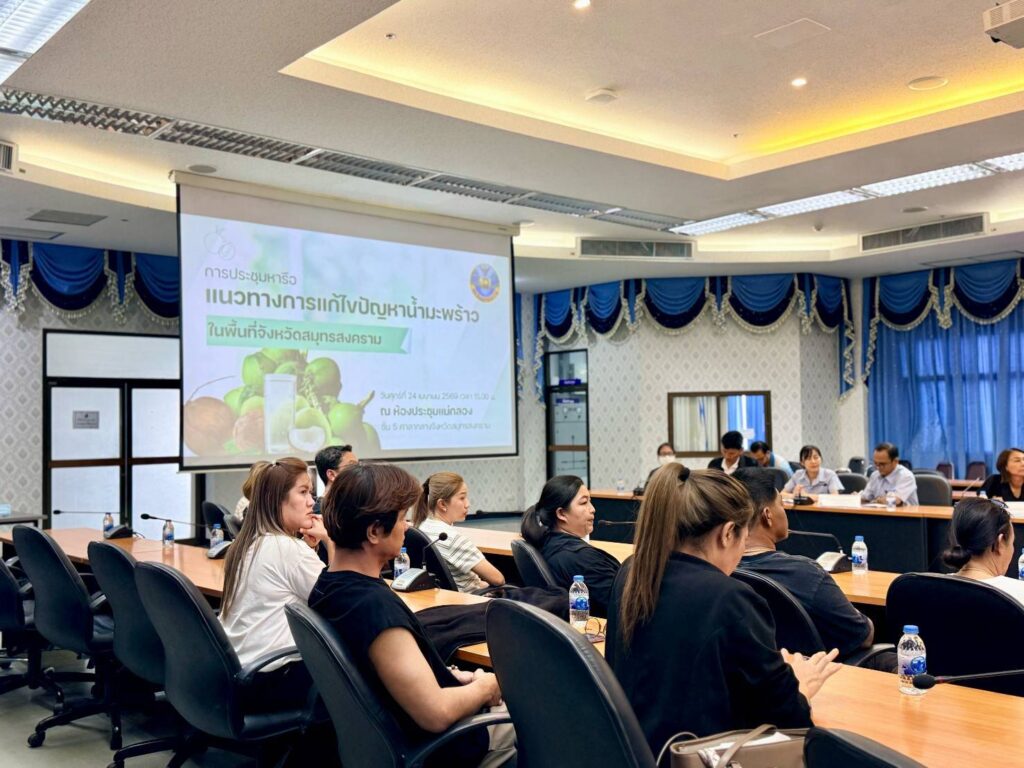 วันที่ 24 เมษายน 2569 นายประสิทธิ์ สิงห์ชา เกษตรจังหวัดสมุทรสงคราม พร้อมด้วยนายเสนีย์ ตรุยานนท์ หัวหน้ากลุ่มยุทธศาสตร์และสารสนเทศ สำนักงานเกษตรจังหวัดสมุทรสงคราม เข้าร่วมประชุมหารือแนวทางการแก้ไขปัญหาน้ำมะพร้าวปลอมในพื้นที่จังหวัดสมุทรสงคราม เพื่อหารือแนวทางและมาตรการแก้ไขปัญหาการปลอมปนน้ำมะพร้าว และราคามะพร้าวตกต่ำ ร่วมกับกลุ่มผู้ประกอบการแปรรูปมะพร้าวในพื้นที่จังหวัดสมุทรสงคราม โดยมี นายชยชัย แสงอินทร์ ผู้ว่าราชการจังหวัดสมุทรสงคราม เป็นประธาน หัวหน้าส่วนราชการ และกลุ่มผู้ประกอบการแปรรูปมะพร้าว เข้าร่วม ณ ห้องประชุมแม่กลอง ชั้น 5 ศาลากลางจังหวัดสมุทรสงคราม