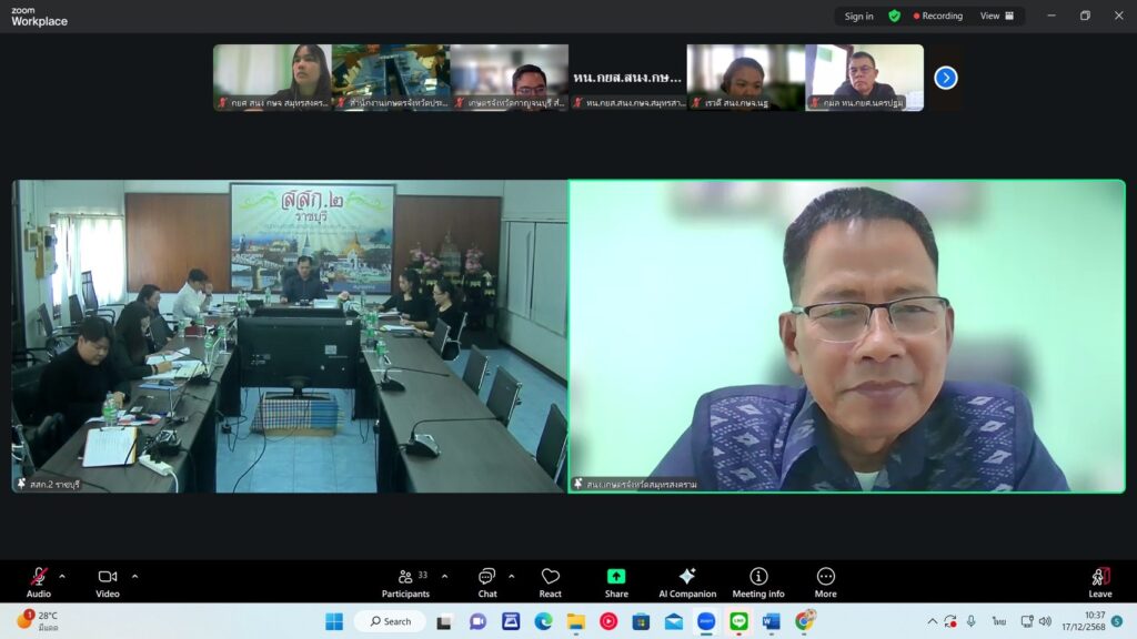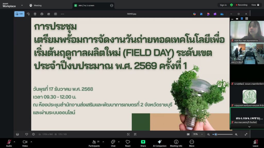 วันที่ 17 ธันวาคม 2568 นายประสิทธิ์ สิงห์ชา #เกษตรจังหวัดสมุทรสงคราม พร้อมด้วย นายเสนีย์ ตรุยานนท์ หัวหน้ากลุ่มยุทธศาสตร์และสารสนเทศ และเจ้าหน้าที่กลุ่มยุทธศาสตร์และสารสนเทศ ร่วมกับนายมนัส บุญพยุง ประธาน ศพก. ระดับจังหวัด ร่วมประชุมเตรียมความพร้อมการจัดงานวันถ่ายทอดเทคโนโลยีเพื่อเริ่มต้นฤดูกาลผลิตใหม่ (Field Day) ระดับเขต ประจำปีงบประมาณ พ.ศ.2569 ผ่านระบบออนไลน์ เพื่อพิจารณาจังหวัดที่มีความพร้อมในการจัดงาน และเตรียมความพร้อมในการดำเนินงานร่วมงานดังกล่าว ณ สำนักงานเกษตรจังหวัดสมุทรสงคราม